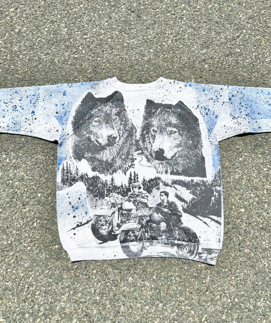 Vintage All over Print Nature Wolves Motorcycle Biker Crewneck Sweatshirt Size M Medium