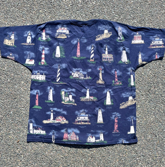 Vintage American Coastal Lighthouse 90's All Over Print AOP T Shirt Size 2XL Navy Blue
