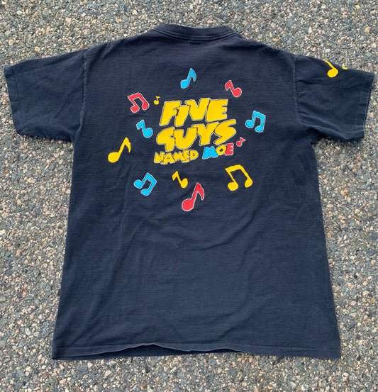 Vintage "Five Guys Named Moe" 90's All Over Print West End Musical Production Jazz Band T Shirt Size Large Made in USA and Single Stitch