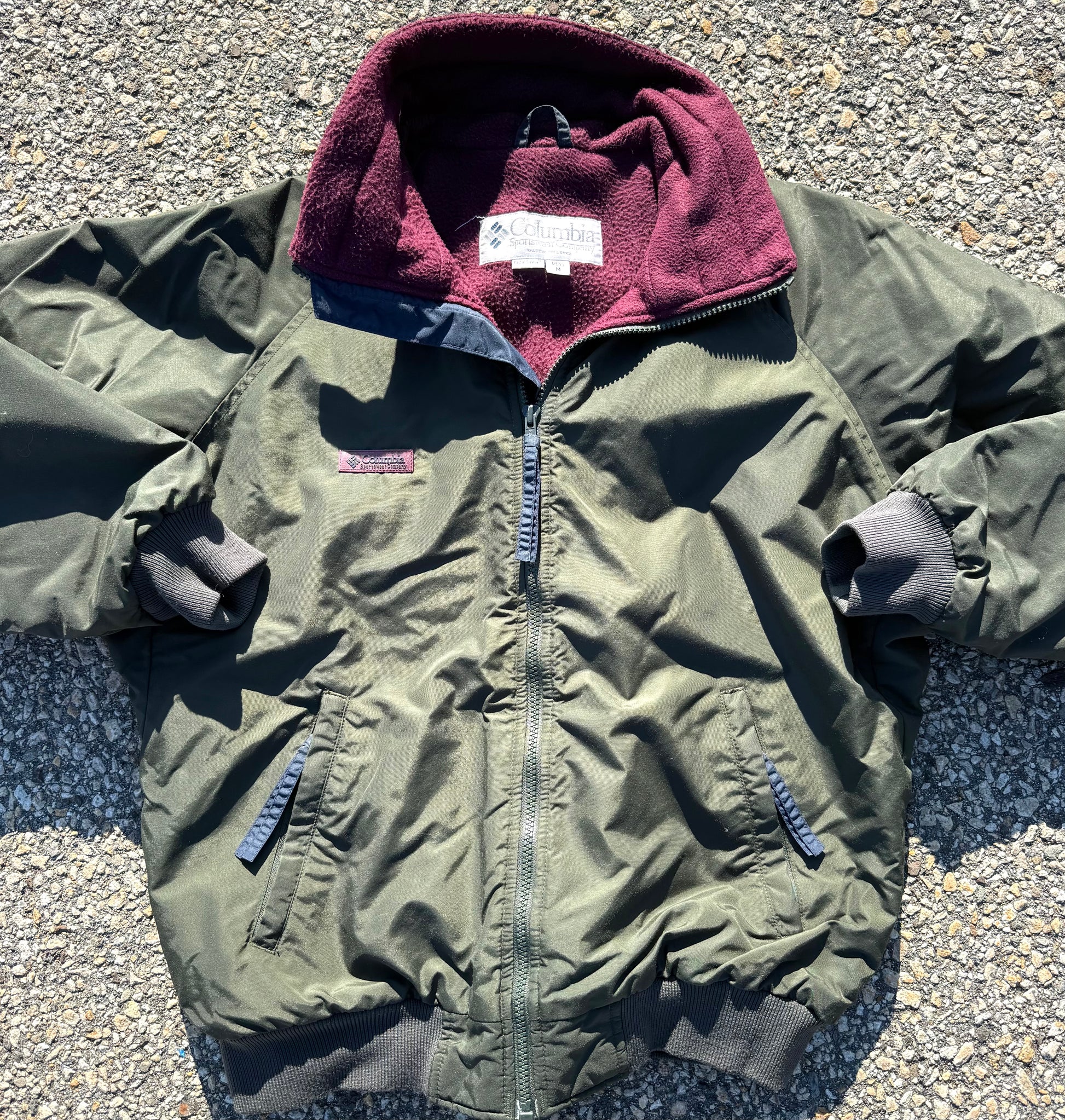 Vintage 90's Columbia Fleece Lined Mens Bomber Jacket Size M Medium Army Green with Maroon